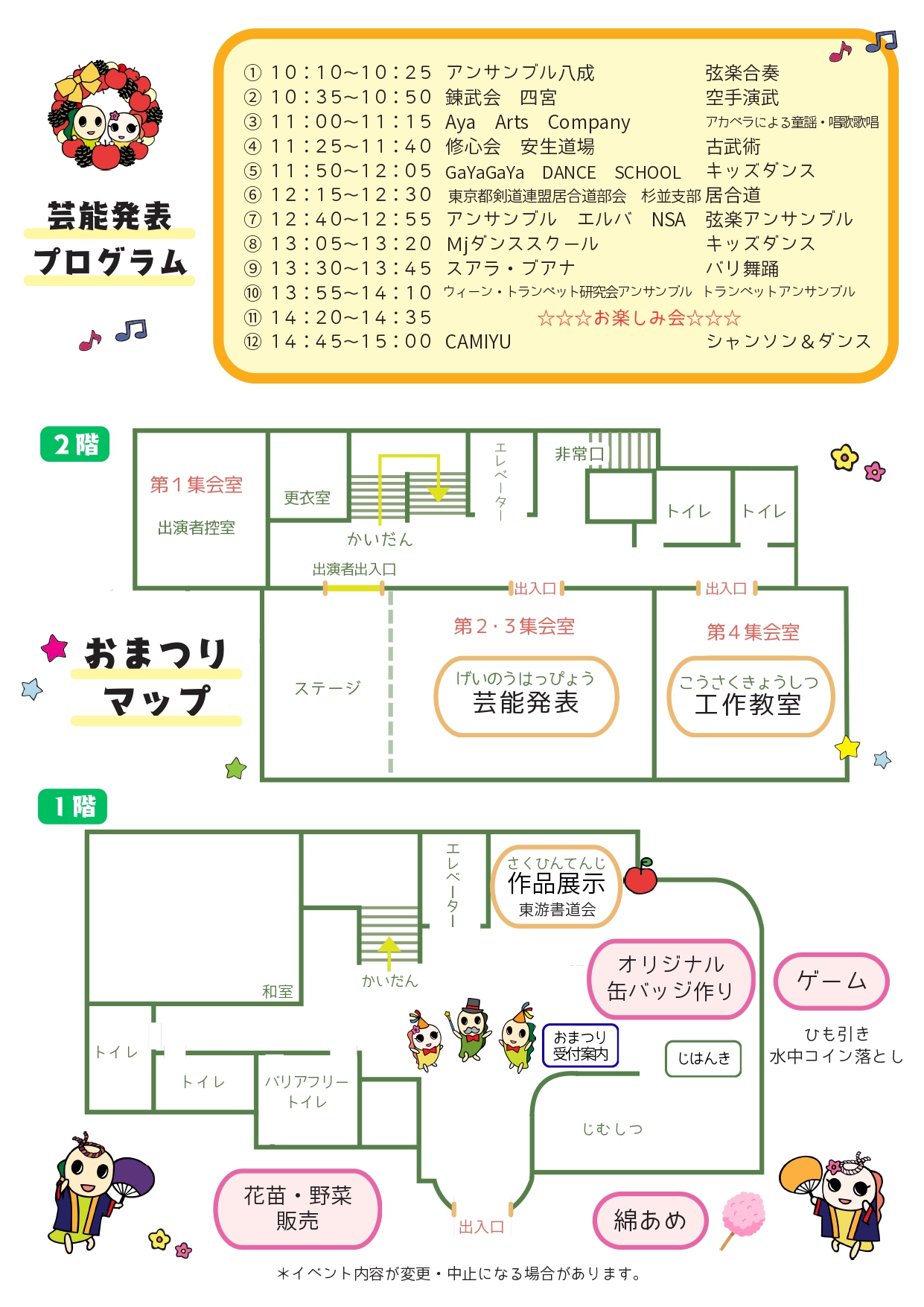楽しいステージ発表や作品展示、工作教室に加え、花苗・野菜の販売やゲームコーナー、綿あめ、オリジナル缶バッジ作りなど、子どもから大人まで楽しめる催しが盛りだくさんです。
