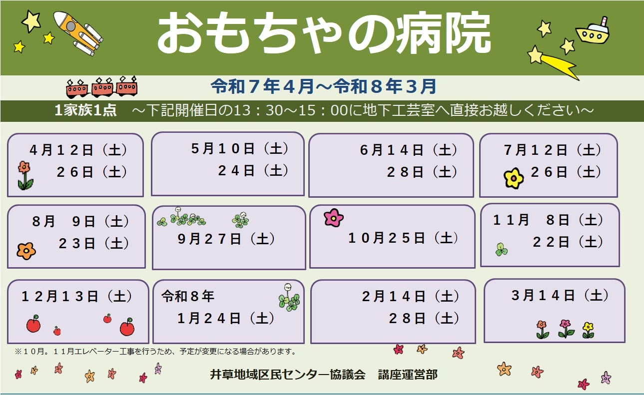大変お待たせいたしました!おもちゃの病院、令和8年3月までの開催予定表が出来上がりました。