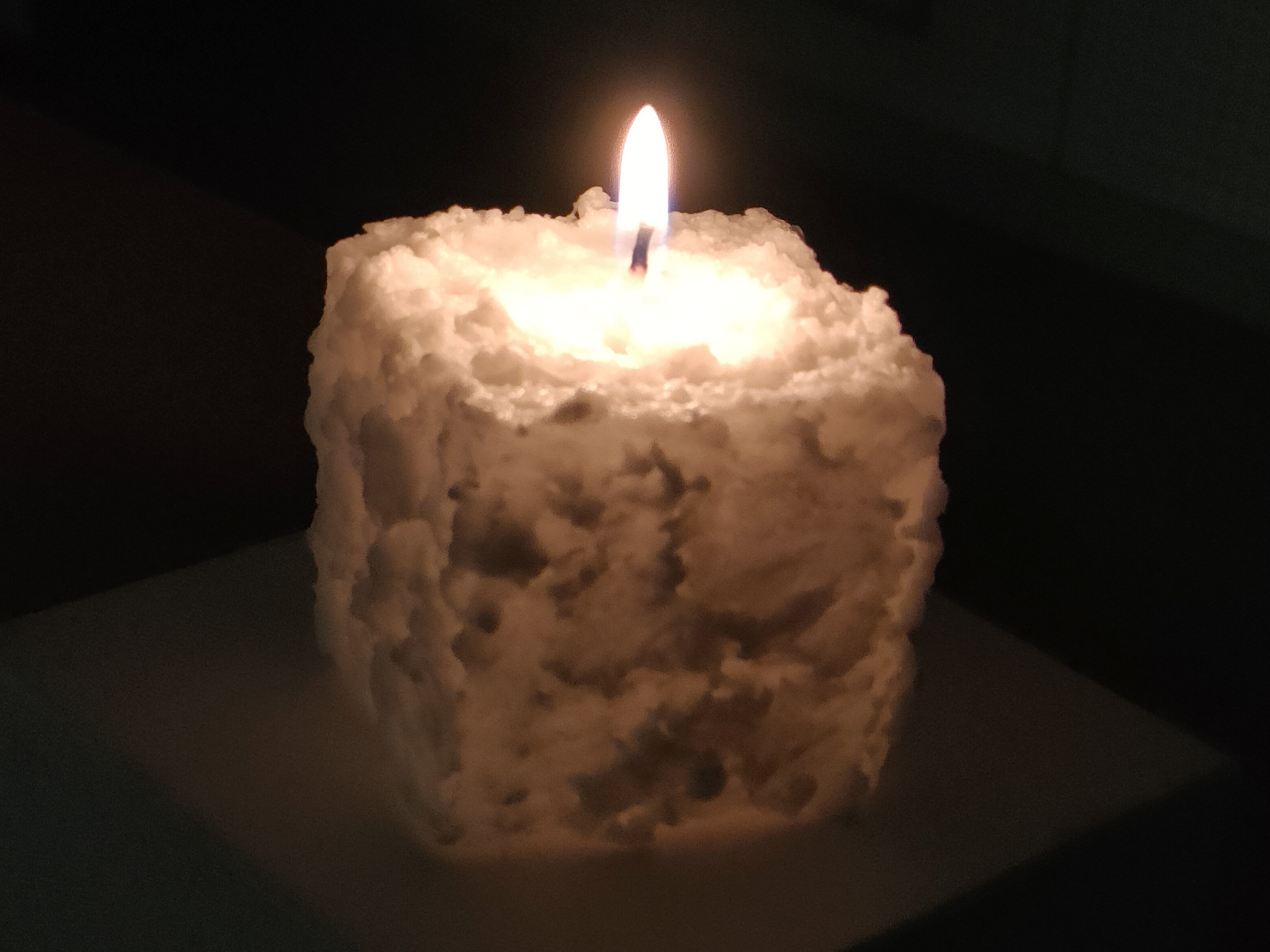 四角いベースキャンドルにパームワックスを少しずつ重ねていくと、雪のような質感に仕上がります。完成したキャンドルは一つひとつ表情が異なり、世界に一つだけの作品となりました。