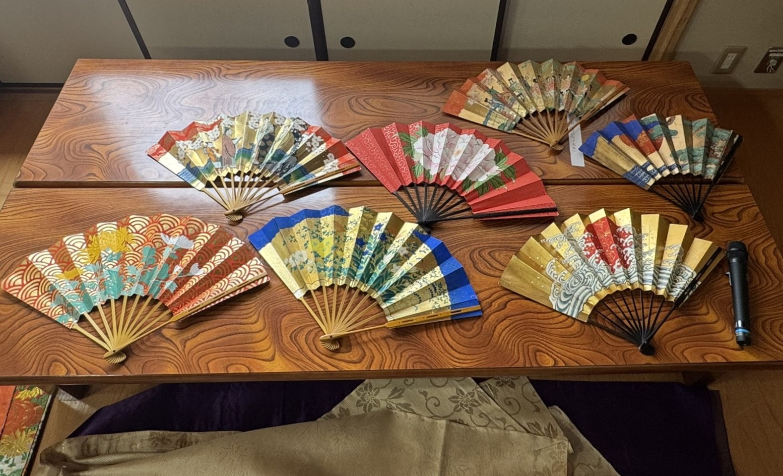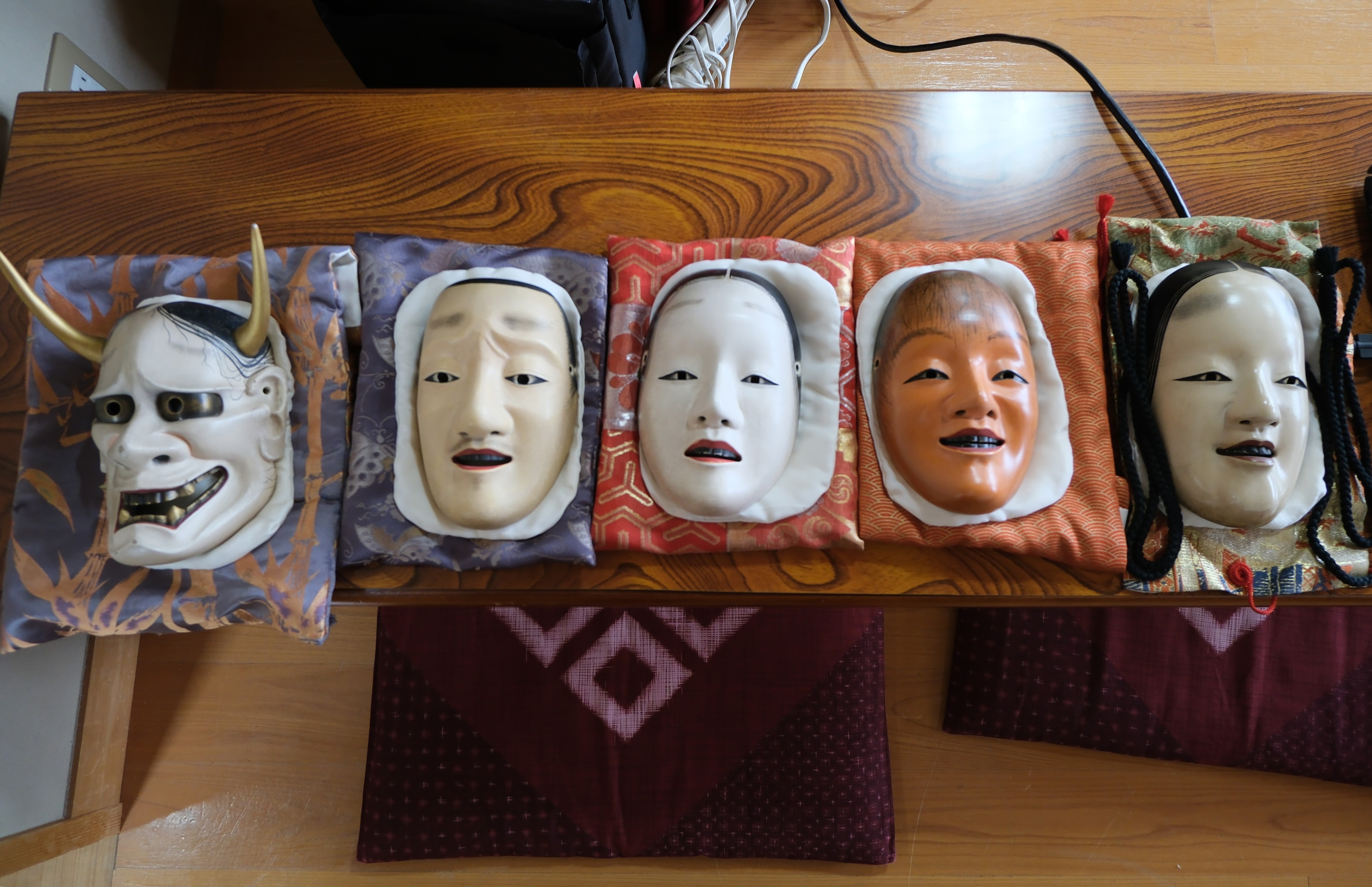 能舞台の構造やその意味、さらにお囃子の楽器(笛、小鼓、大鼓、太鼓)の特徴についても丁寧な解説がありました。また、角度や光によって表情が変化する能面、正絹からなる美しい能装束、様々な絵柄をもつ扇の説明がありました。