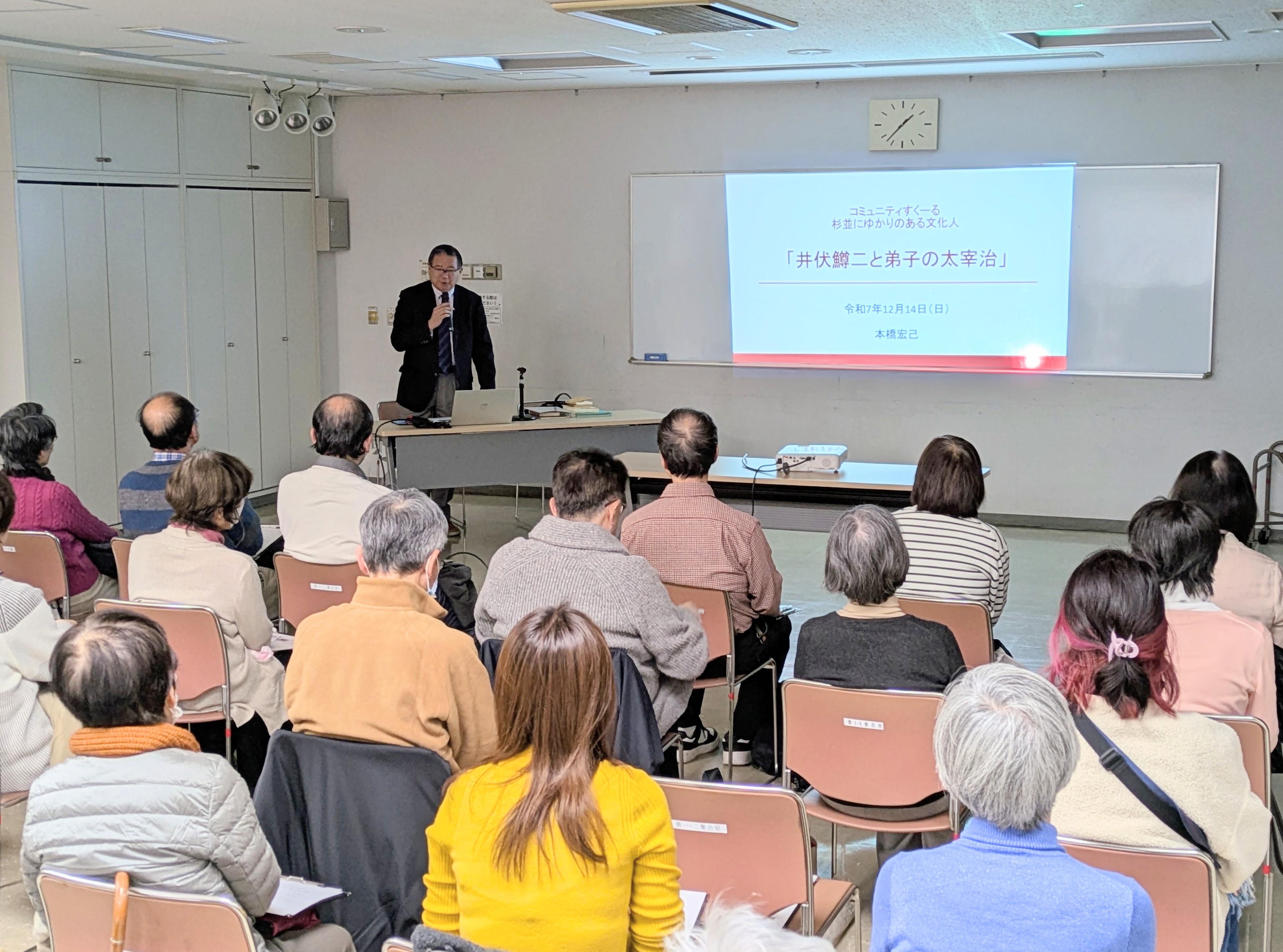 井伏鱒二という存在、そして杉並という環境が、太宰という一人の作家の歩みに少なからぬ影響を与えたことが丁寧に語られ、文学史上の人物としてだけでなく、一人の人間としての太宰像に触れる機会となりました。地域と文学との結びつきを改めて考えさせられる時間となりました。